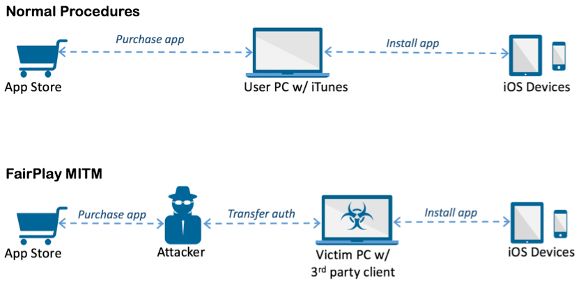 Appleは、ユーザーに、ユーザーのコンピュータで稼働しているiTunesクライアントを通じて、App StoreからiOSアプリを購入およびダウンロードすることを許可しています。その後、ユーザーはコンピュータを使用してアプリをiOSデバイスにインストールします。iOSデバイスは、アプリが実際に購入されたことを検証するため、インストールされたアプリごとに認証コードを要求します。FairPlay MITM攻撃では、攻撃者はApp Storeからアプリを購入し、認証コードをインターセプトして保存します。その後、iTunesクライアントの動作をシミュレートするPCソフトウェアを開発し、アプリが被害者によって購入されたものとiOSデバイスが確信するように見せかけます。そのため、ユーザーは一切支払いをすることなくアプリをインストールでき、ソフトウェアの作成者はユーザーが気付かないうちに潜在的な悪意のあるアプリをインストールできます。