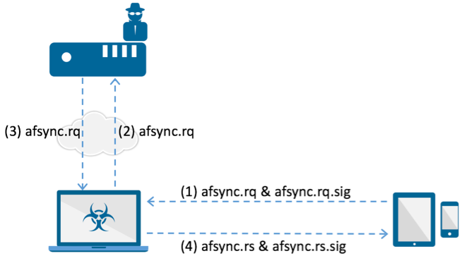 こうした設計上の不備によりFairPlay MITM攻撃が許されてしまいました。このような攻撃では、攻撃者は1台のコンピュータを認証した後、(任意の地域にある)App StoreからiOSアプリを購入することができます。その結果、正しいafsync.rs応答を生成することが可能になる恐れがあります。次に、攻撃者はこのafsync.rsをC2サーバ上にサービスとして導入することができます。こうなると、攻撃者にはPCまたはMac用にクライアント ソフトウェアを作成することが可能です。このクライアント ソフトウェアは、iTunesの機能を装いiOSデバイスと接続してiOSアプリをインストールします。クライアントはiOSデバイスからafsync.rqを受信した場合、C2サーバにこのファイルをアップロードした後、C2サーバから正しいafsync.rsを得てこの応答をiOSデバイスに送信することが可能です。