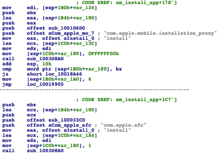 関数sub_4A8CE0は、\files\i4\60.ipaに格納されたIPAファイルを読み取って、am_install_appを呼び出します。am_install_app関数はi4m.dllファイルに実装されています。この関数は、com.apple.mobile.installation_proxyサービスと通信して、IPAファイルをiOSデバイスにインストールします。これは非常に古典的な手法です。