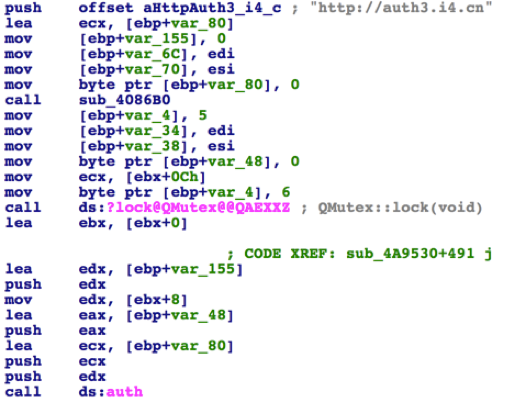 続いてsub_4A9530が、同じくi4m.dllに実装された関数authを呼び出します。