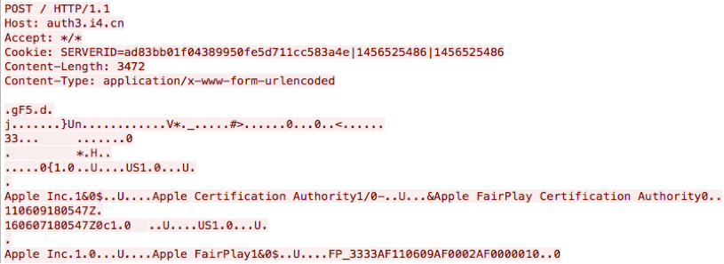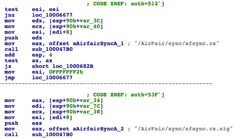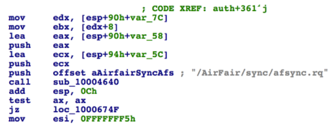 関数authはFairPlay MITM攻撃を実装します。接続されたiOSデバイスから/AirFair/sync/afsync.rqを受信し、HTTP POST (関数sub_10005DB0に実装)によってC2サーバauth3.i4[.]cnにファイルを送信します。そしてC2サーバからafsync.rsを受信し、この応答をiOSデバイスの/AirFair/sync/afsync.rsに戻します。