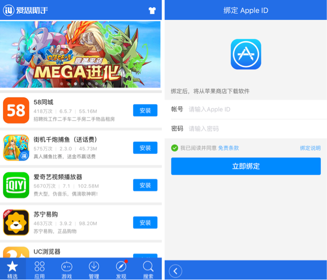 攻撃を遂行するため、作成者は、FairPlay MITM攻撃を実行するための「爱思助手(Aisi Helper)」と呼ばれるWindowsクライアントを作成しました。Aisi Helperは、システムの再インストール、ジェイルブレイク、システム バックアップ、デバイス管理、システム クリーニングなどのiOSデバイス向けサービスを提供するソフトウェアであると称しています。しかし、それ以外にも、Aisi HelperがインストールされているPCに接続されたあらゆるiOSデバイスに、悪意のあるアプリを密かにインストールします(注目すべきは、感染時に最新のアプリがiOSデバイスにインストールされるだけでなく、3つすべてが同時にインストールされる点です)。これらの悪意のあるiOSアプリは、ユーザーがiOSアプリやゲームをダウンロードするように、作成者によって制御されているサード パーティのアプリ ストアへの接続を提供します。ユーザーはさらに機能を使用するためにApple IDとパスワードの入力が求められ、入力されたこれらの認証情報は、暗号化された後、AceDeceiverのC2サーバにアップロードされます。私たちは、2015年3月の日付のエンタープライズ証明書を持つ、早期バージョンのAceDeceiverも識別しました。