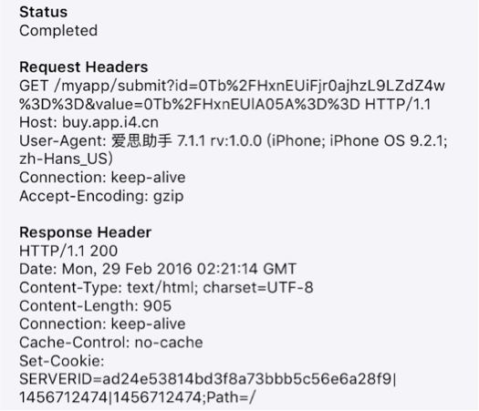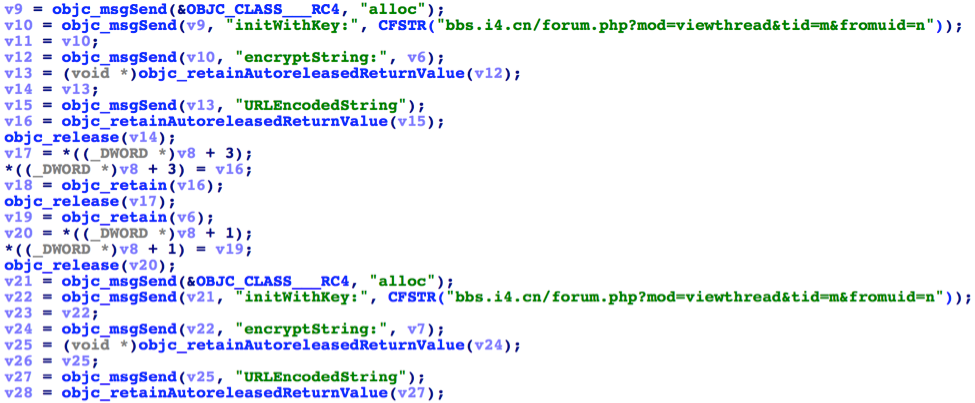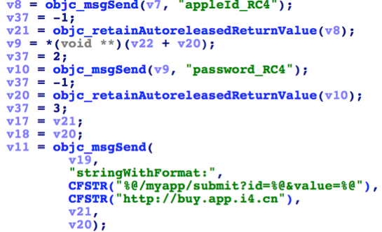 暗号化が完了すると、Apple IDとパスワードはBase64エンコードされた後、URLエンコードされます。そして、LoginEntityインスタンスのプロパティappleId_RC4およびpassword_RC4として設定されます。ここで[LoginEntity getLoginInfo]が呼び出されます。このメソッドで、暗号化されたApple IDとパスワードがAceDeceiverのC2サーバにURL「http://buy.app.i4[.]cn」で送り返されます。