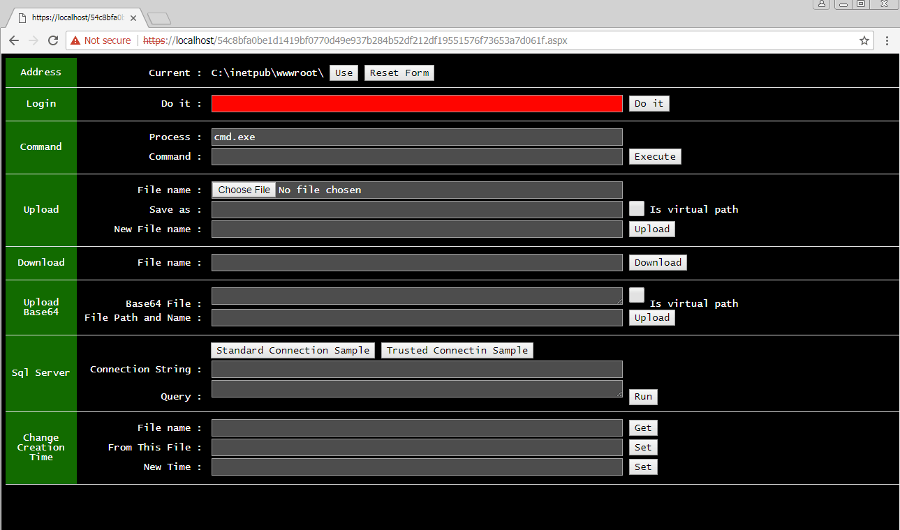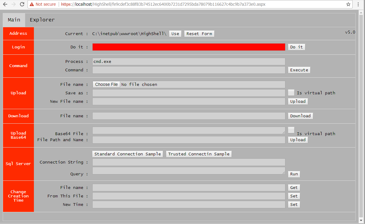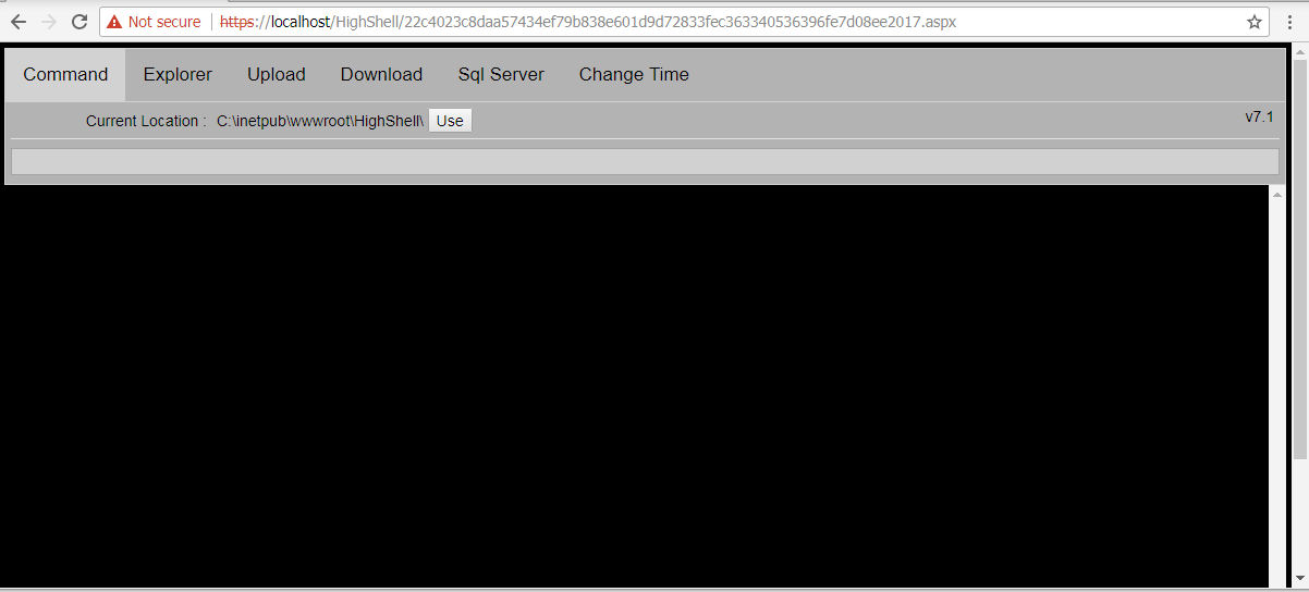 データ ダンプから検出されたHighShell v7.1亜種は、旧バージョンと同じ機能を提供し、表形式の手法を引き継いでいますが、主要機能を「Command(コマンド)」、「Explorer(エクスプローラー)」、「Upload(アップロード)」、「Download(ダウンロード)」、「Sql Server(SQLサーバー)」、「Change Time(時刻変更)」をはじめとする複数のタブに分割する拡張が行われています。図14に、HighShell v7.1とその複数のタブを示します。