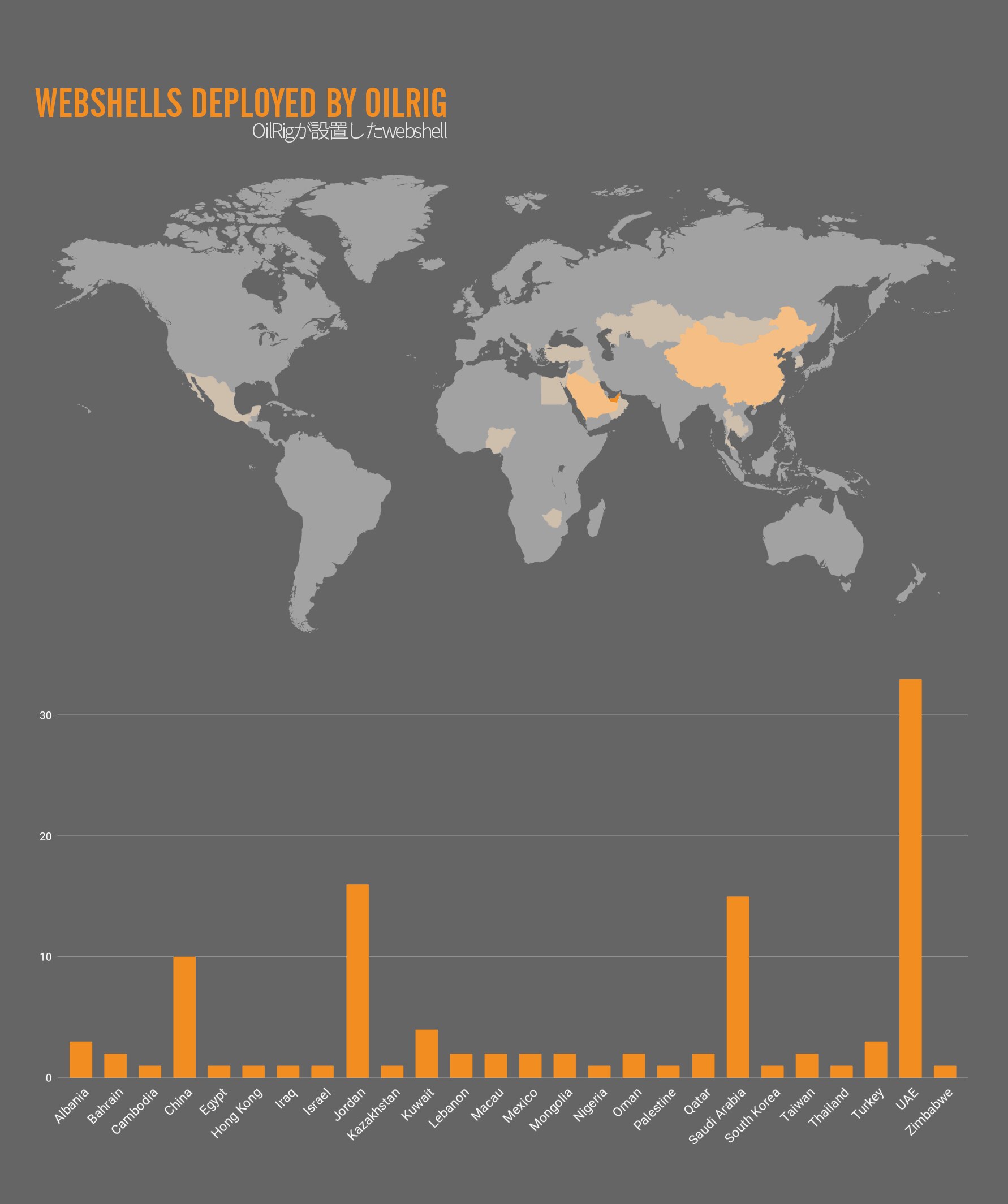 最近、運用側から、データ ダンプが漏洩され、OilRig活動に関連するデータであると一般の人々が主張するために利用されるようになりました。弊社は、資格情報ダンプ、バックドア、Webシェル、その他の興味深いファイルが含まれたデータ ダンプを取得しました。その後、いくつかの報道機関とその他のリサーチャーが独自の評価を行ってきましたが、弊社の評価では、データ ダンプに含まれるアーティファクトが、既知のOilRigの動作およびツールセットと実際に一致することがわかりました。さらに、データ ダンプによって、ある時点までさかのぼって、以前の調査とOilRigの運用データを比較することができました。これによって、弊社の調査の精度を検証できただけでなく、以前に存在した、OilRigの攻撃ライフ サイクルのギャップを埋めることができました。データ ダンプを分析することで、BONDUPDATERバックドアとそのサーバー コンポーネントがどのように機能するか、OilRigによる展開内のいくつかのWebシェルの外観と機能、これらの各ツールの内部動作名を正確に特定し、さらに、世界的な見地からOilRig動作がいかに広範囲に及ぶかについて、より明確に理解できました。