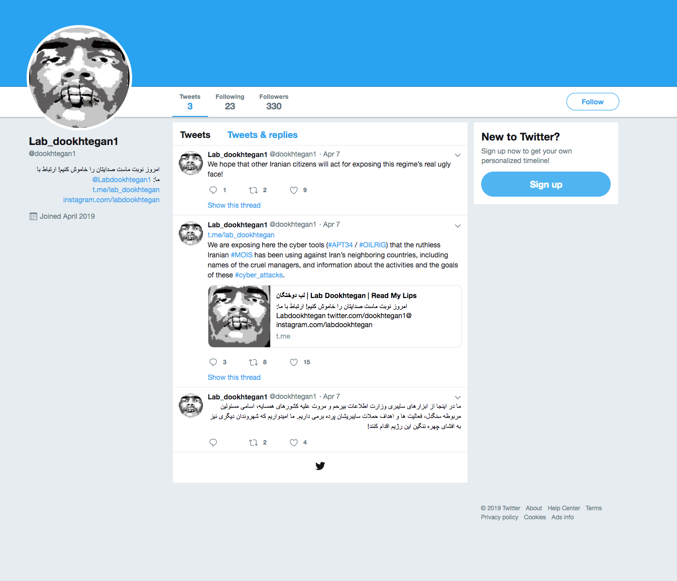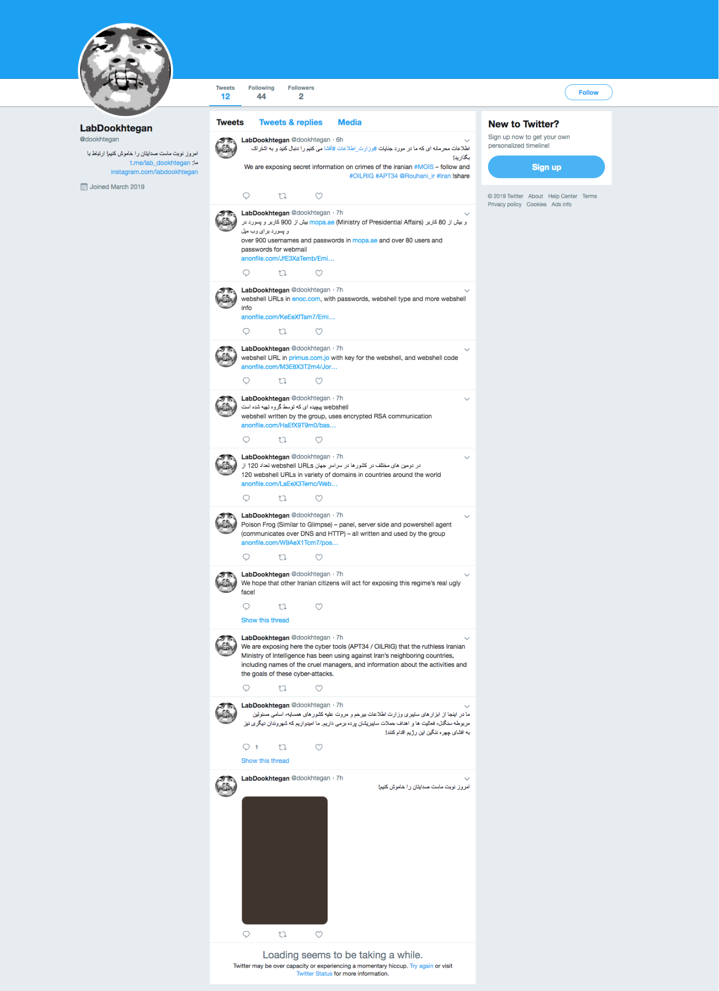 2019年3月中旬に、ユーザー ハンドルが@Mr_L4nnist3rの不明な存在がいくつかのハッキング フォーラムとTwitter上に出現し、彼らはOilRigグループによって使用された内部ツールとデータを含むデータ ダンプにアクセスしたと主張しました。初期の主張には、OilRigオペレーターが攻撃用に使用した可能性のあるシステムのいくつかのスクリーンショット、DNSハイジャックに使用されたと見られるスクリプト、およびOilRigバックドア用のコマンド&コントロール サーバー パネルを含むと称するファイル名がGlimpse.rarのパスワード保護されたアーカイブが含まれていました。その直後に、ユーザーハンドルが@dookhteganのTwitterアカウントが出現し、図1に示すとおり、彼らもOilRigグループによって使用された内部ツールとデータを含むデータ ダンプにアクセスしたと主張しました。このアカウントでは、Mehdy Kavousiという名前の注目を集めたイラン人亡命希望者の2004年の有名な画像が使用されています。彼の亡命申請を拒否し、彼をイランに送還することは、彼を死に至らしめるのと同じであることを示すため、目と口を閉じて縫い合わせたあの画像です。おそらく、この特定の画像は抗議の象徴として選択されたのでしょうが、それ以外の理由はわかりません。初期アカウントの作成以降、オリジナルの定式化されたバージョンがプロフィール画像として置き換えられ、元の個人が誰であるかを判別するのはさらに一段と困難になりました。