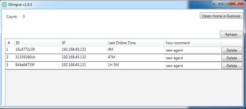 Glimpseパネルのバージョン「v1.0.5」は、攻撃者が侵害したシステムにインストールしたさまざまなエージェントを編成するために使用するツールです。パネルを使用して、攻撃者は侵害したエンドポイントとの間でファイルをアップロードおよびダウンロードしたり、さらに、コマンドを実行したりすることができます。コンパイル時間によると、Glimpseパネルの開発者はこのツールを2018年9月1日に作成しました。図3は、テスト環境での3つの異なるエージェントのリストを示すメインGlimpseパネルを示しています。