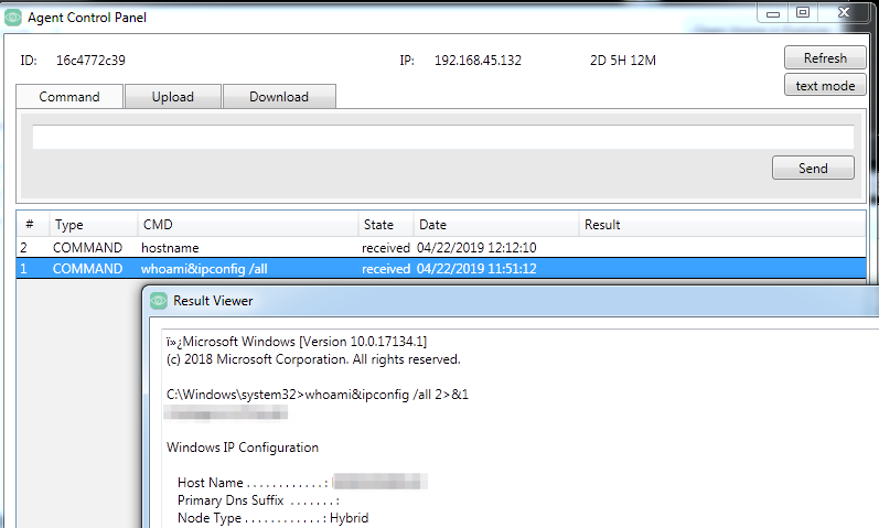 特定のエージェントとやり取りするため、攻撃者はエントリを選択して、エージェント コントロール パネルを開きます。エージェント コントロール パネルには、攻撃者がコマンドの発行、エージェントとの間でのファイルのアップロードおよびダウンロードを実行できるインターフェイスを備えた3つのタブがあります。「Command (コマンド)」タブは、図4に示すとおり、以前に実行したコマンド、それらが実行された日時、およびそれらのステータスを示します。