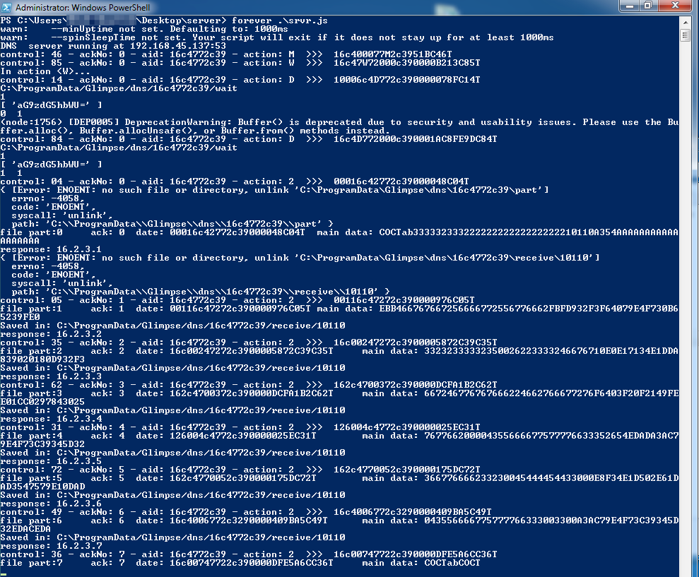 Glimpseのサーバー部分はDNSサーバーとして機能することでパネルと連携して動作します。これは、JavaScriptで記述され、Node.jsランタイムで実行されます。サーバーには、srvr.jsという名前のファイルがあり、Read me.txtファイルによると、このファイルはNode.js内でforever start srvr.jsを使用して実行されます。図6は、Glimpseエージェントからのインバウンド ビーコンに応答し、コマンドwhoamiを送信しているGlimpseサーバーを示しています。また、スクリーンショットは、Glimpseサーバーがエージェントによって実行されたwhoamiコマンドの結果を受信していることも示しています。