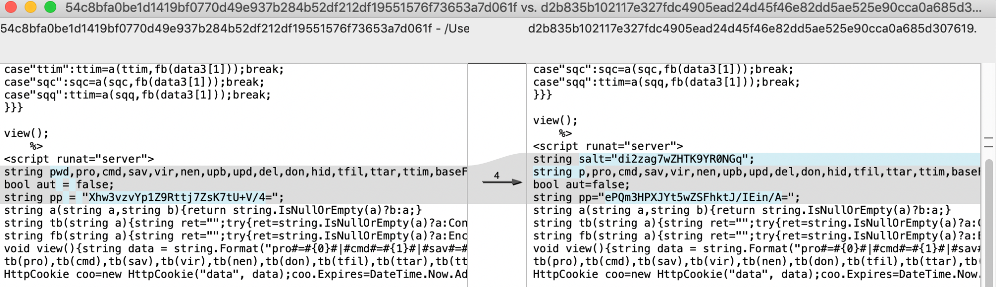 見た目の類似性を補うために、2つのWebシェルのコードを分析して、重複部分を特定しました。2つのWebシェルは、コードの大部分を共有しており、違っている部分のほとんどは変数名や関数名のわずかな違いだけでした。一番大きな違いは、HighShell v5.0 Webシェルには、認証用に攻撃者が設定したパスワードに適用するソルト値が追加されているという点です。図11では、左側のTwoFaceのペイロード(SHA256:54c8bfa0be1d1419bf0770d49e937b284b52df212df19551576f73653a7d061f)と右側のHighShell v5.0(SHA256:d2b835b102117e327fdc4905ead24d45f46e82dd5ae525e90cca0a685d307619)を比較しています。コードを比較すると、HighShellのコードにあるソルト変数(値は「di2zag7wZHTK9YR0NGq」)が、左側のTwoFaceのコードには存在しないことがわかります。