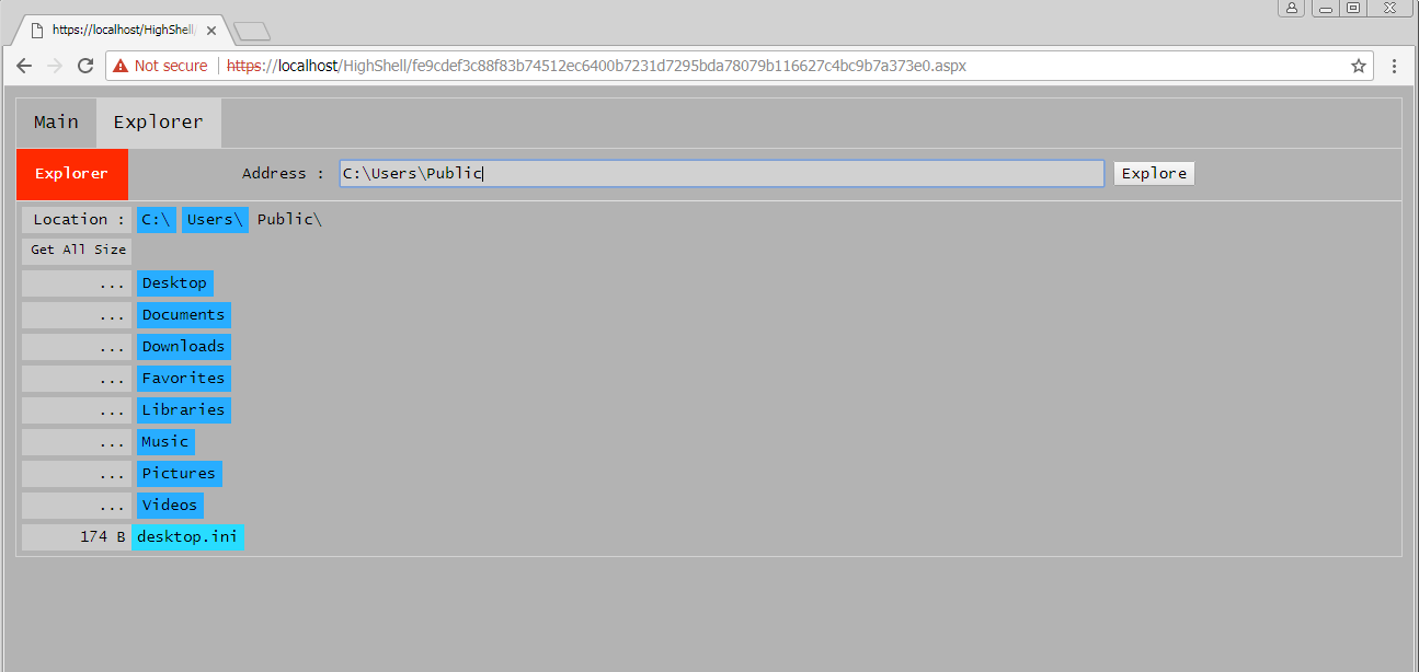 図12は、ユーザー インターフェイスで新しいカラー スキームを使用している、HighShell v5.0のもう1つのサンプルです。ただし、その機能の大部分は、HyperShellから抽出したv5.0の他のサンプルと同じです。HighShell v5.0のこの亜種の興味深い新機能として、「Main(メイン)」タブと「Explorer(エクスプローラー)」タブで構成される表形式のインターフェイスが導入されています。「Main(メイン)」タブには、TwoFaceペイロードとHighShell v5.0の他のサンプルと同じ機能があります。「Explorer(エクスプローラー)」タブでは、図13に示すように、侵害されたサーバーのファイルシステム内を攻撃者が移動できるようになっています。
