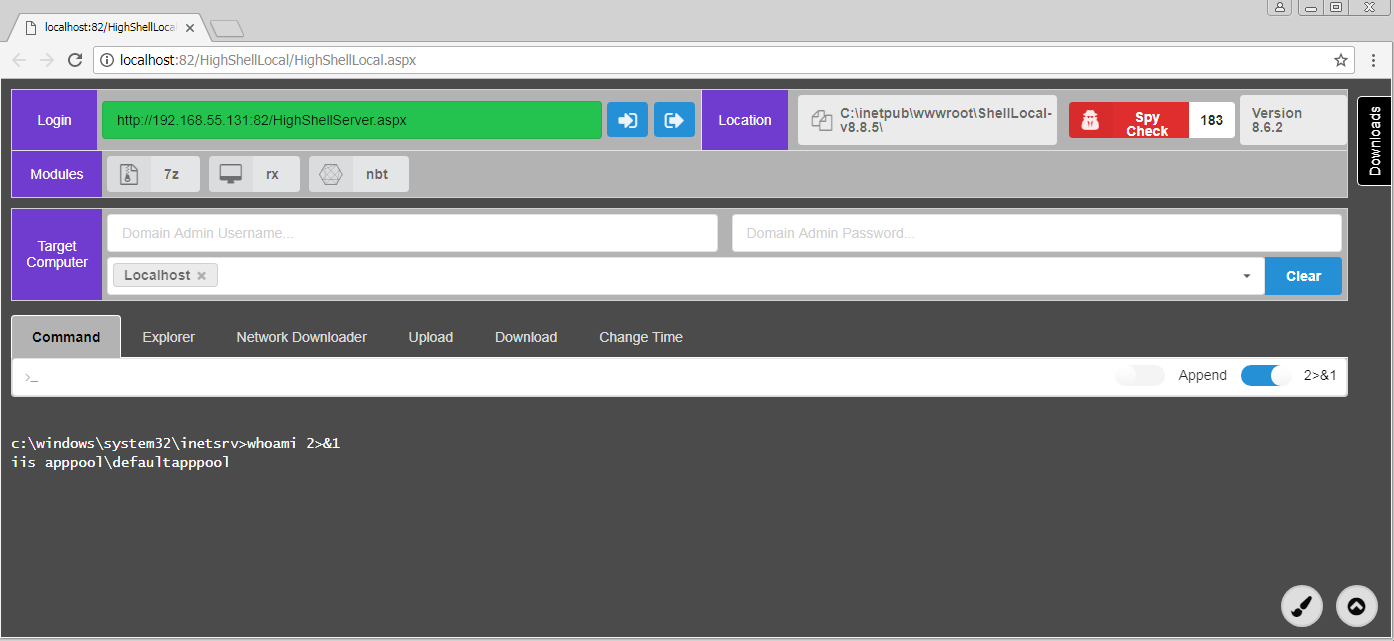 HighShell 8.6.2には、Webシェルに付属するさまざまなモジュールを使用する機能が含まれています。これらのモジュールは、Webシェルにあらかじめパッケージ化されているPE実行可能ファイルであり、Webシェルの機能をさらに拡張します。表5に、HighShellのこの亜種に付属している各モジュールを示します。Webシェルの「Explorer(エクスプローラー)」タブでは、7zaモジュールを使用してファイルをアーカイブします。Webシェルは、nbtscanモジュールを使用して、ネットワークをスキャンして接続されているシステムを調査し、通信可能なシステムのIPリストを作成します。Webシェルがリモート実行モジュールを使用する方法は解明できませんでしたが、実際にはリモート実行モジュールを使用していないと思われます。