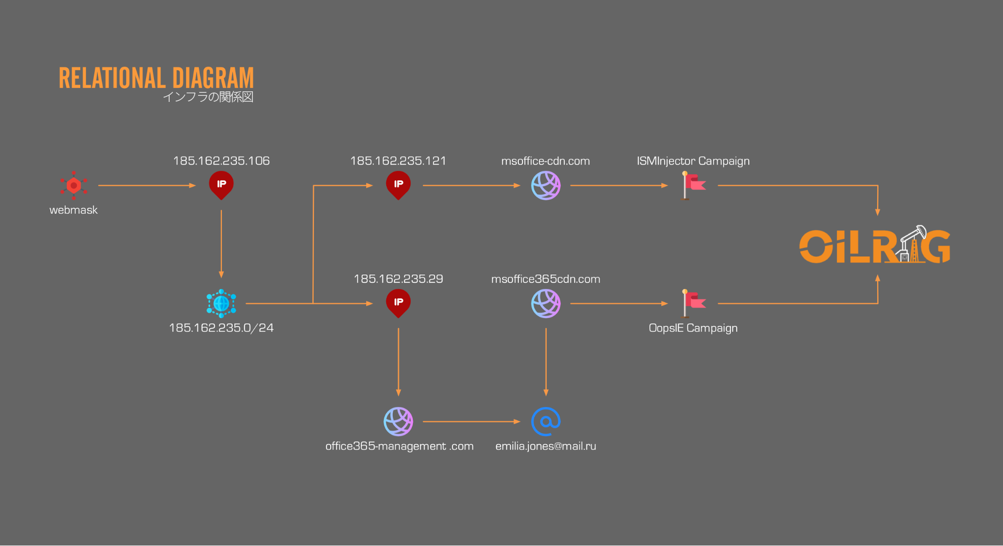guide.txtのある部分では、リダイレクト先の正当なドメインに対応する攻撃者のIP (185.162.235[.]106)を示すことによって、標的例を提供しているようです。このIPを分析すると、以前確認したOilRigインフラストラクチャとの関連を疑わせる、複数の興味深いデータ ポイントが得られます。ホスティング プロバイダを調査したところ、このIPはイランのホスティング プロバイダであるNovinVPSに関連付けられています。このIPの自律システム名は、Serverius Holding B.V.がその割り当てを管理していることを示していますが、これは弊社が以前OilRigグループに関連付けられていることを確認した自律システム名です。実際、クラスCのIPブロックである185.162.235[.]0/24を調査すると、弊社が以前OilRigグループがC2サーバーに使用していることを確認したIPが他に少なくとも2つ存在することがわかります。具体的には、185.162.235[.]29(ドメインはoffice365-management[.]com)と185.162.235[.]121(ドメインはmsoffice-cdn[.]com)です。office365-management[.]comは、ISMInjectorバックドアを配信するOilRig活動で使用するC2サーバーとして、2017年10月に初めて確認されました。2018年2月の後半に、弊社は、WHOIS登録者アーティファクトの再利用、共有されているSSL証明書、および共有されているクラスC IPブロックを特定することで、インフラストラクチャ全体のブロック構造を、OopsIEバックドアを配信する別の攻撃のものと関連付けることができました。図17は、DNSハイジャックの関連ファイルと、OilRigと関係がある既知のインフラストラクチャの間の関係を示しています。
