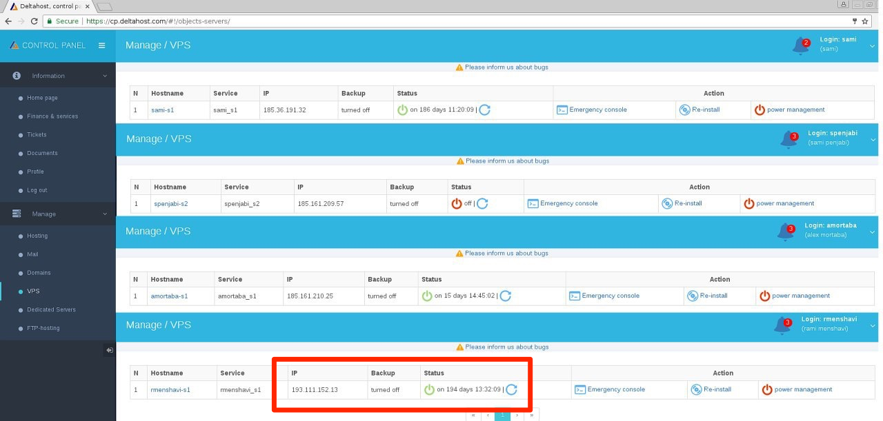 次のスクリーンショットでは、DeltaHostのVPSアカウントの管理パネルに4つの仮想サーバーが表示されています(図20を参照)。表示されている仮想サーバーの中の1つは、IPアドレス193.111.152[.]13でホストされ、このコントロール パネルがアクセスされたと思われる時点で194日間稼働していました(図20の赤枠で囲んだ部分を参照)。