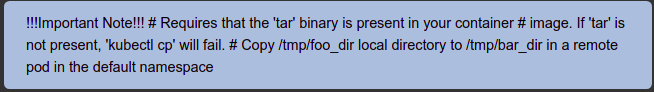 ユーザーマシンでtarアーカイブを作成および解凍する場合、kubectlはcmd/cp/cp.goのtar解析コードを利用します。ただし、コンテナでこれらの操作を行う場合、kubectlはコンテナ内でtarバイナリを実行します。このため、cpコマンドが機能するには、この注記に書かれているように、tarバイナリがコンテナ内に存在する必要があります。