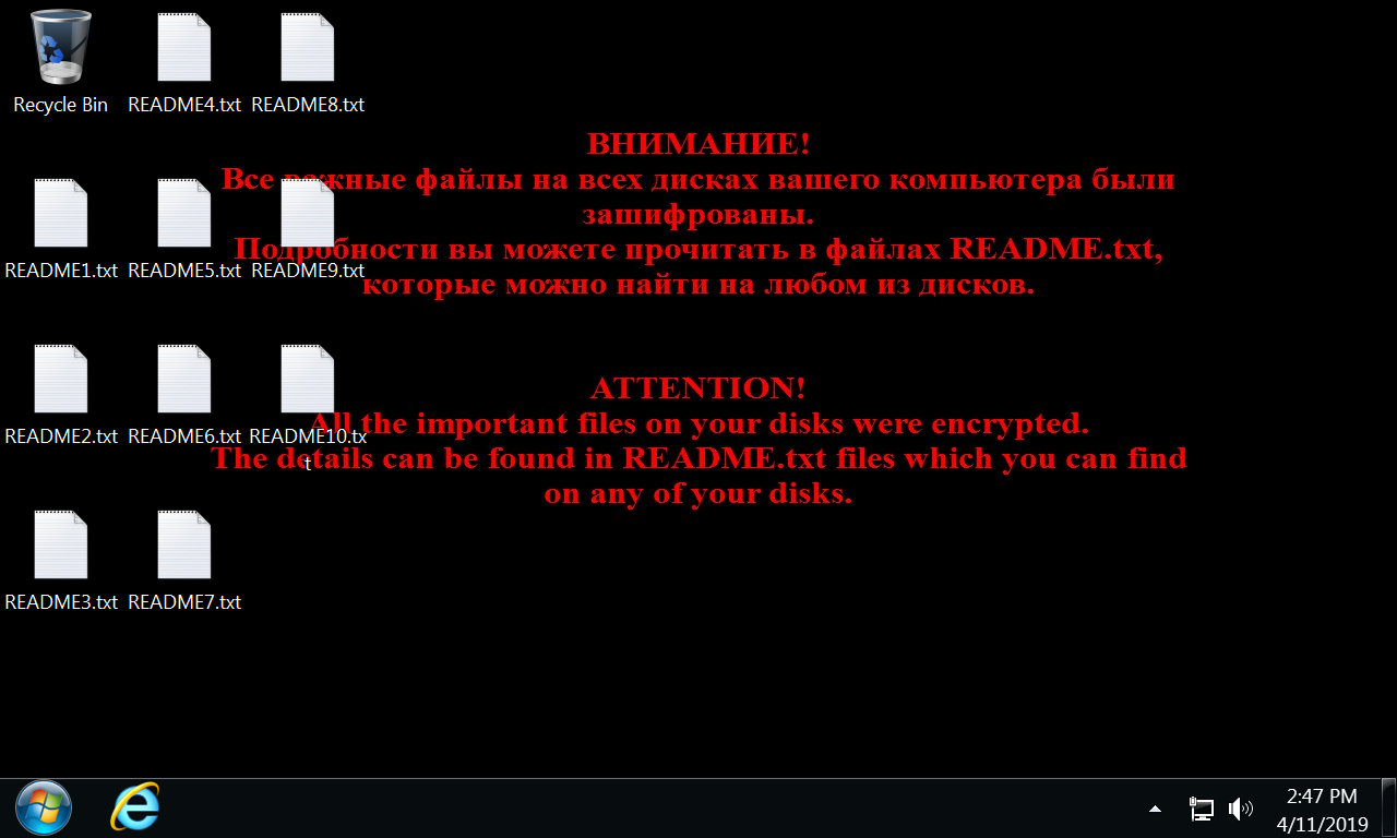 WindowsホストがShade ランサムウェアに感染すると、デスクトップの背景が感染を知らせるものになり、README1.txtからREADME10.txtと命名された10個のテキストファイルがデスクトップに表示されます(図1)。