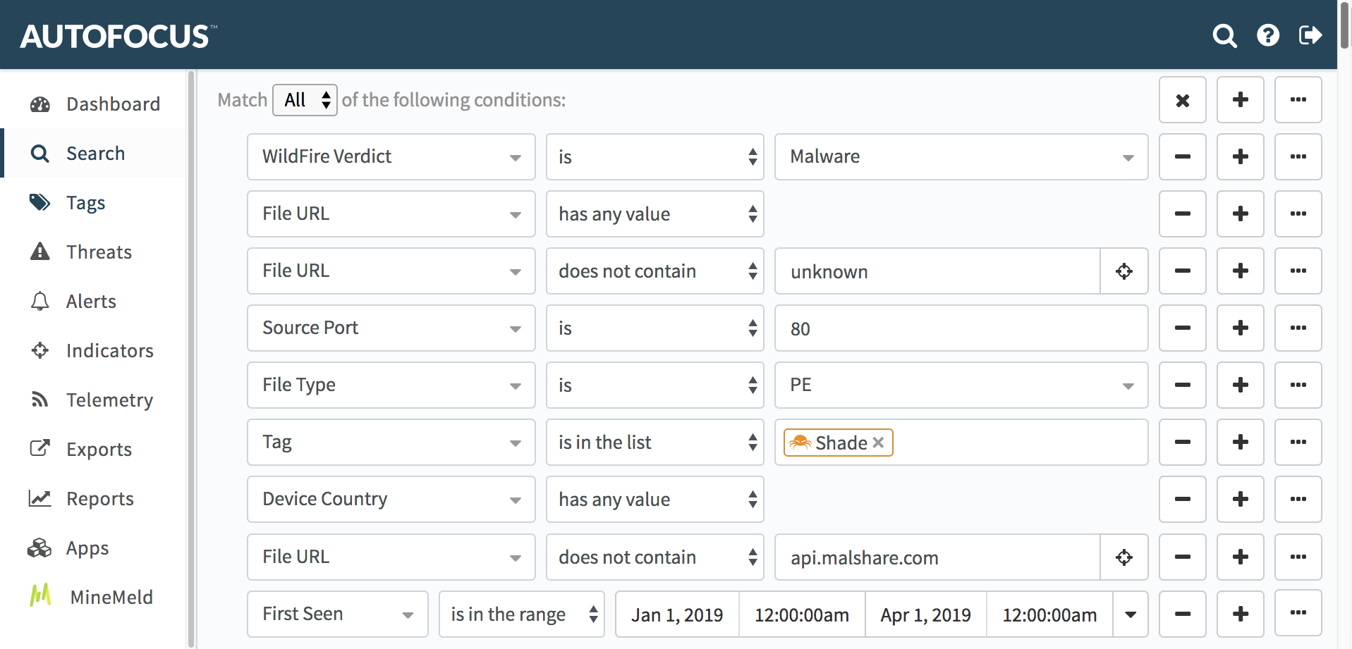 最後にオンラインのサンドボックスやオンライン共有サービスへの明らかなマルウェア提出を検索対象から除外しました。AutoFocusデータベースで私たちが利用した検索パラメータは次のとおりです。