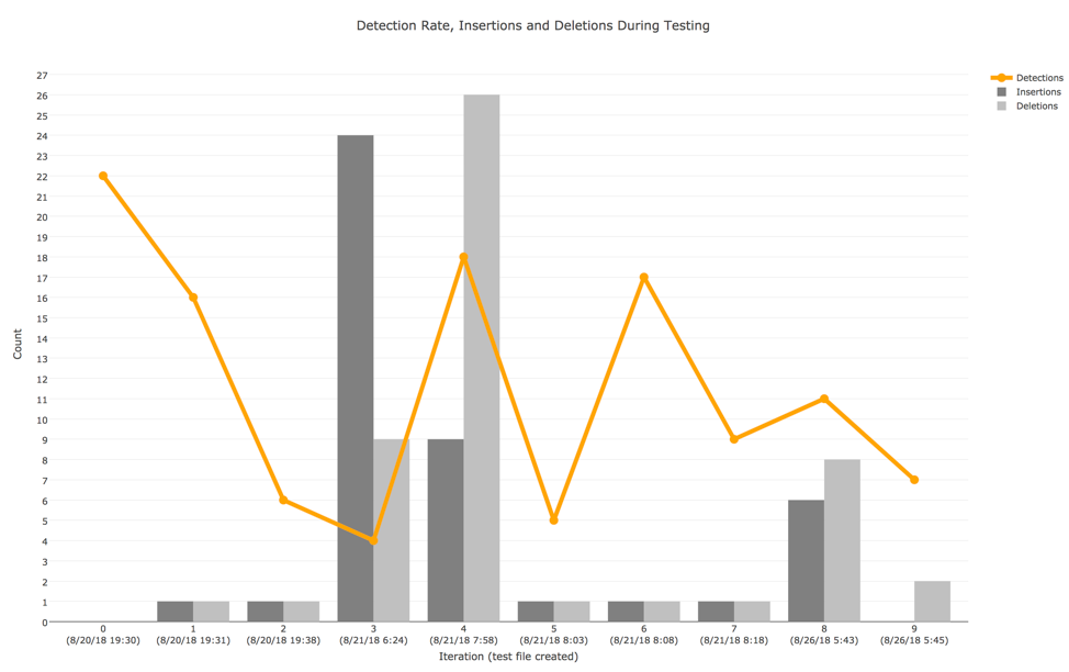図2の図表で、テスト実行者によるテストの各繰り返しでのスプレッドシートの変更に伴って、検出率が上がったり、下がったりしているのがわかります。これらの検出率の変化によって、テスト実行者は、ファイルの変更度合いによって検出されるかどうかを判断することができます。このテスト活動を分析するに当たり、弊社は各繰り返しで実行された変更の数を比較しました。特に、GitHubファイル差分に基づく、挿入行数および削除行数と検出件数を比較して、変更量が検出率に明らかに影響を与えるかどうかを判断しました。図2では、わずかしか変更されていない繰り返し1および2では、検出件数が多く減り、変更が多い繰り返し3および4では、検出件数が少ししか減らない、あるいは大きく増加するという結果になっています。