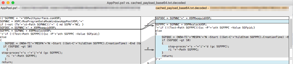 図14 コマンドの文字列難読化の使用および変数名の変更を示す繰り返し8に関するファイル間の差分のスクリーンショット