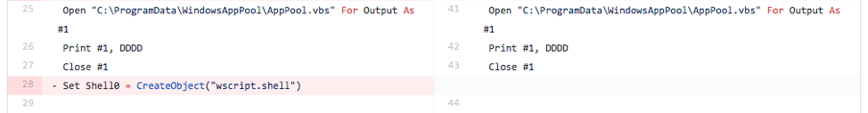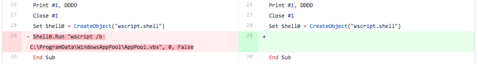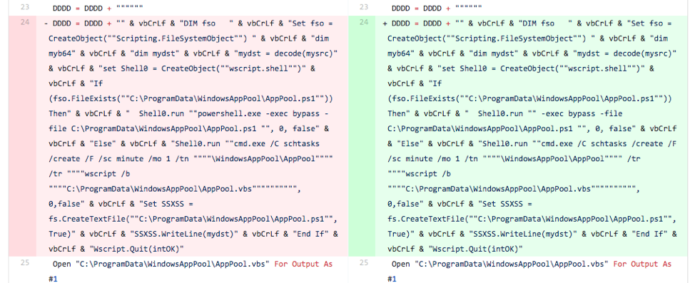 この繰り返しでは、テスト実行者は1つのシンプルな変更を加えており、文字列「powershell.exe」をAppPool.vbsファイルに記述されないように削除しています。基本的にこの変更によって、VBScriptがAppPool.ps1を正常に実行できなくなるため、インストール プロセスが中断されます。ただし、テスト実行者は検出がこの文字列に起因するかどうかを判断するためにこの変更を加えています。図3の差分のスクリーンショットでは、「powershell.exe」文字列がなくなっていることはすぐにはわかりませんが、行24の「Shell0」を探すと、左の(赤い)テキストには「powershell.exe -exec bypass」と表示されているのに、右の(緑の)テキストでは「-exec bypass」となっていることがわかります。