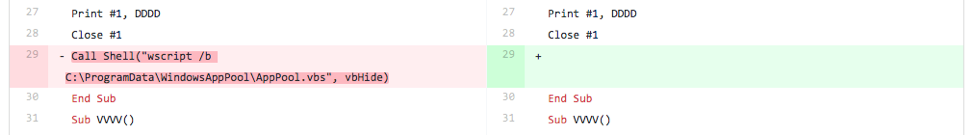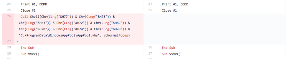 テストの最後の繰り返しでは、テスト実行者は、難読化された"wscript"文字列を含む"AppPool.vbs"スクリプトの呼び出しに使用するShell関数の呼び出しに使用するコードの行全体を削除します。図15は、テスト実行者が行全体を削除しただけで、別のコードに置き換えなかったことを示しています。これは、マクロがVBScriptファイルを実行せず、システムに保存しないことを示唆しています。
