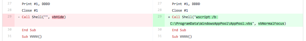 テスト実行者は、組み込みShell関数を使用し、wscriptアプリケーションを使用して"AppPool.vbs"スクリプトを実行する行(図9の行29)も追加しました。テスト実行者は、Shell関数の呼び出しに、非表示ウィンドウでコマンドを実行する"vbHide"フラグを使用しました。