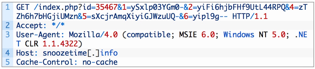 次のHTTPリクエストの例に示すように、この情報が盗み出され、‘snoozetime[.]info’ドメインに送られます。