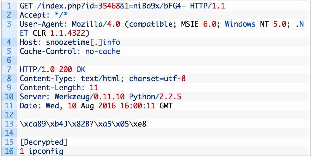 以下のリクエストの例は、C2サーバからAveoマルウェアへの‘ipconfig’コマンドの送信を示しています。