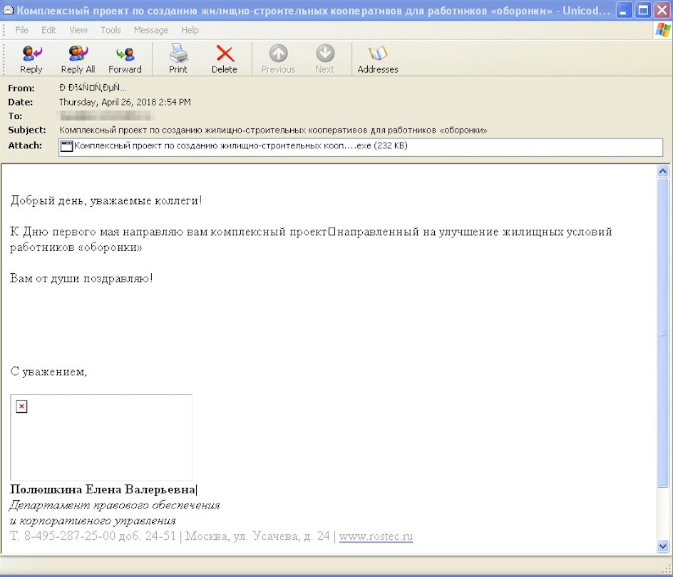 図1に、標的となった組織に送信されたスピアフィッシング メールを示します。この電子メールは、ハイテク産業製品の開発、製造、および輸出を促進するロシア国営企業、Rostecから送信されたように偽装されています。この電子メールは、Rostecのリーガル サポートおよびコーポレート ガバナンス部門から送信されていることを伺わせる内容で、国防産業従事者の住宅事情の改善を目的としたプロジェクトの詳細を含んでいます。興味深いのは、標的となった企業とRostecとの間に関連が見られる点です。攻撃者は、Rostecと標的の関係性を悪用して、合法であるかのような雰囲気を攻撃にまとわせようとしている可能性があります。