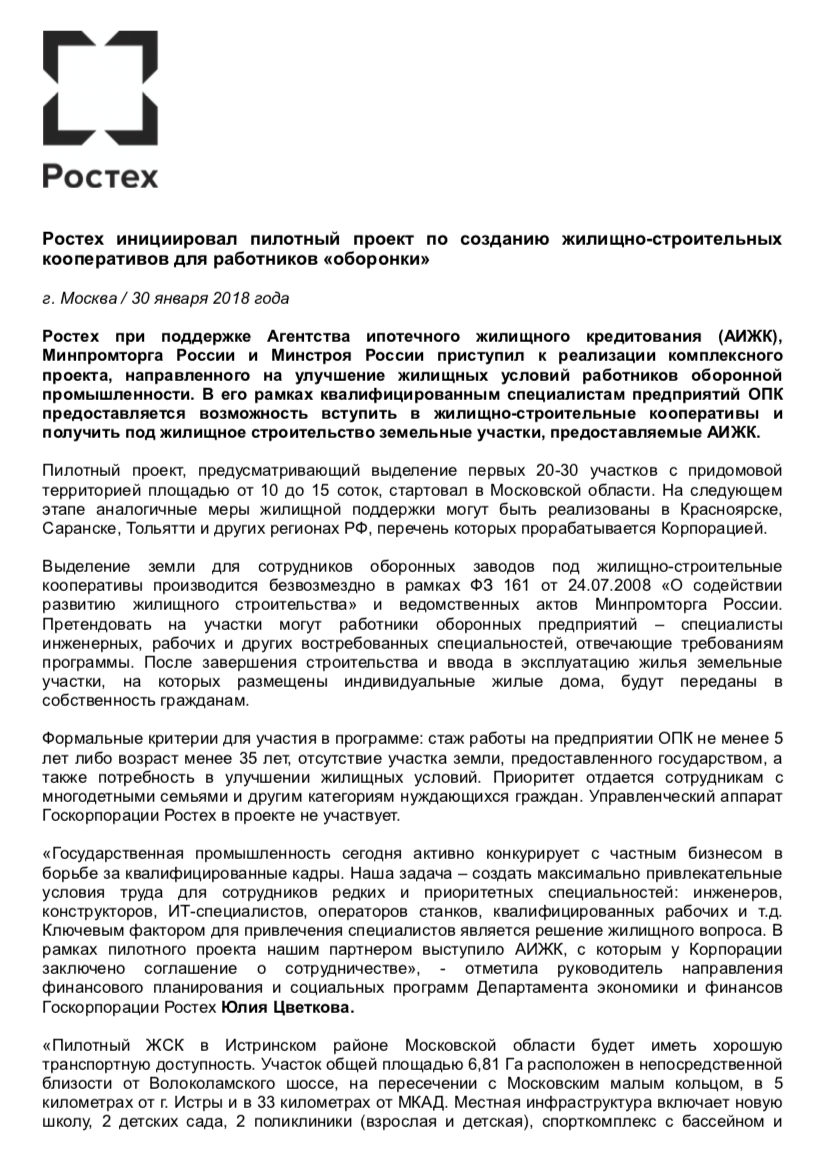 悪意のある実行可能添付ファイルが開かれると、メインとなるペイロードが被害端末にドロップされ、この被害端末におとりファイルが表示されます。図2にこのおとりファイルの内容を示します。この内容は、2018年1月30日にRostecのWebサイトで公開された記事とまったく同じです。この記事には、Rostecとその他の官庁による新しい住宅供給プロジェクト計画、およびこのプロジェクトの下で無償で住宅供給を受けることができる国防産業従事者の利益が記載されています。