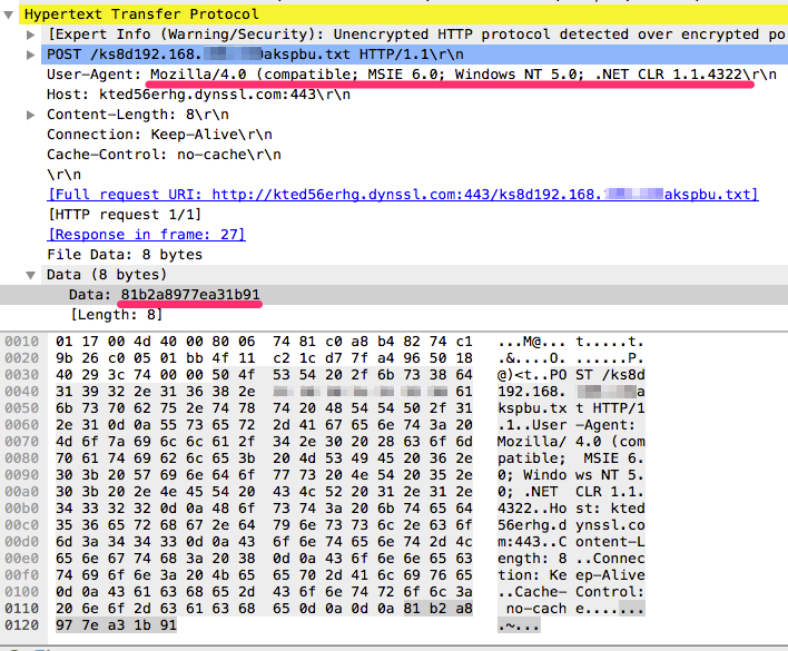 - 同じ不完全なユーザー エージェント文字列「Mozilla/4.0 (compatible; MSIE 6.0; Windows NT 5.0; .NET CLR 1.1.4322」でHTTP POSTメソッドを使用して、hxxp://games.my-homeip[.]com:443/ks8d[IPアドレス]akspbu.txtに接続します。