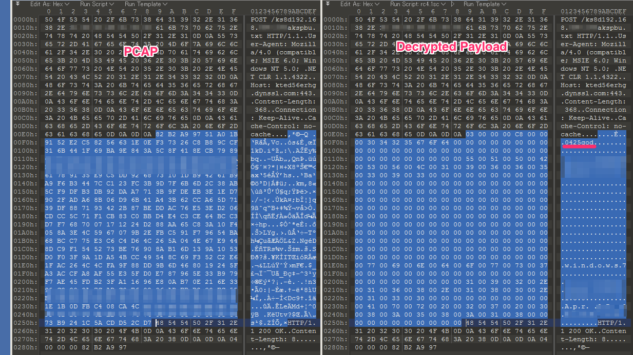 以下に、コマンド「get system info」に対する応答の例を示します。左側がC2とBisonalサンプル間の実際のトラフィックで、右側が復号されたペイロードです。最初のDWORD(4バイト)は指定されたセッション ID 0x00000003で、次のDWORDはバックドア コマンド0x000000C8です。復号されたペイロードのオフセット8には、キャンペーン コードまたはターゲット コードがあります。このサンプルでは「0425god」です。