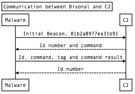 Bisonalに感染した被害端末から最初のビーコンを受信するとすぐに、C2はセッションID番号とバックドア コマンドを返信します。セッションID番号はC2通信を通じて一貫しています。次にマルウェアは、侵害したシステムで特定のコマンドを処理し、その結果をセッションID番号とバックドア コマンド番号とともにC2に返送します。するとC2は、同じセッションID番号を返します。バックドアは5秒待機してから、同じセッションID番号でC2との通信を再開します。