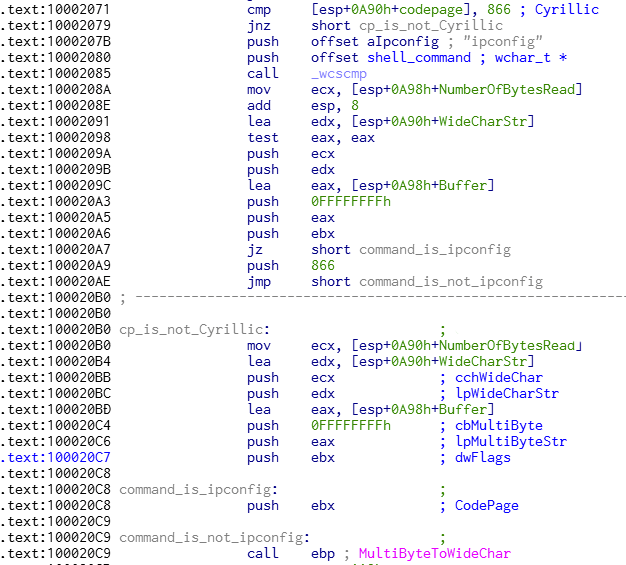 以前のレポートでは、日本、韓国、およびロシアに対する攻撃で使用されたBisonalマルウェアについて説明しました。弊社が発見したこの特定のサンプルは、ロシアの組織を標的としたもので、キリル文字のみに対して特定のシステム言語チェックが行われます。バックドアがシェル アクセス コマンドを受信すると、侵害したシステムのコード ページがチェックされます。チェックの結果がキリル文字であり、シェルへのコマンドが「ipconfig」ではない場合、コマンドの結果テキストのエンコーディングがキリル文字からUTF-16に変換されます。その他のコード ページでは、マルウェアは結果テキストをデフォルトのWindows ANSIコード ページと見なし、UTF-16に変換します。マルウェアが任意のテキストをUTF-16に変換する際、マルウェア作成者がなぜ特にキリル文字を呼び出したのかははっきりしていません。Windows ANSIコード ページは、OSの言語に応じてASCII文字および非ASCII値を国際文字としてサポートしています。UTF-16は、最大で100万文字のUnicodeをサポートしています。結果のキリル文字(およびその他の言語)が文字化けすることを避けるため、開発者はマルウェアにコードを追加しています。