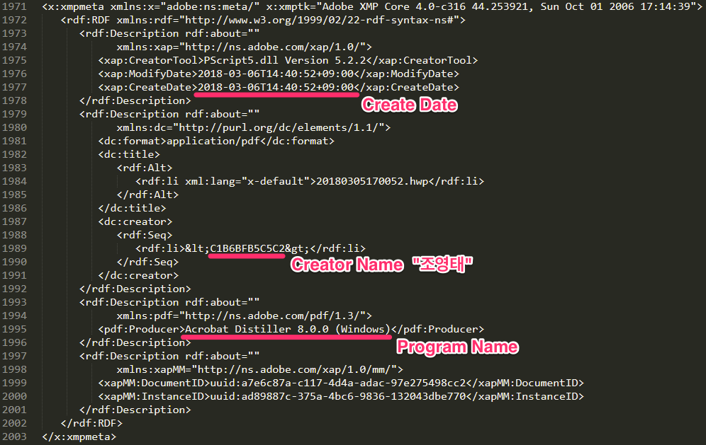 おとりのPDFの内容は、韓国海洋警察庁の職務説明です。元の文書は、2018年3月5日に韓国海洋警察庁のWebサイトに投稿されたHangul Word Processor(HWP)ファイルでした。PDFで確認できるメタデータから判断して、攻撃者がHWPをPDFに変換したと確信しています。以下の図8は、元のファイルをPDFに変換する際に、おとりファイルに追加されたメタデータを示しています。メタデータは、このファイルが3月6日に「조영태」(英語表記はCho Young Tae)によってAdobe Distiller 8.00(Windows)で作成されたことを示しています。