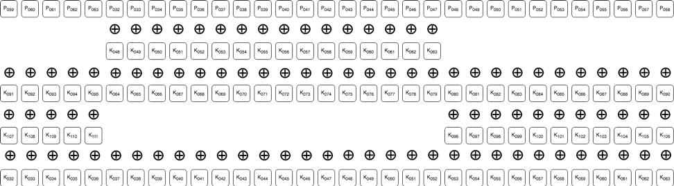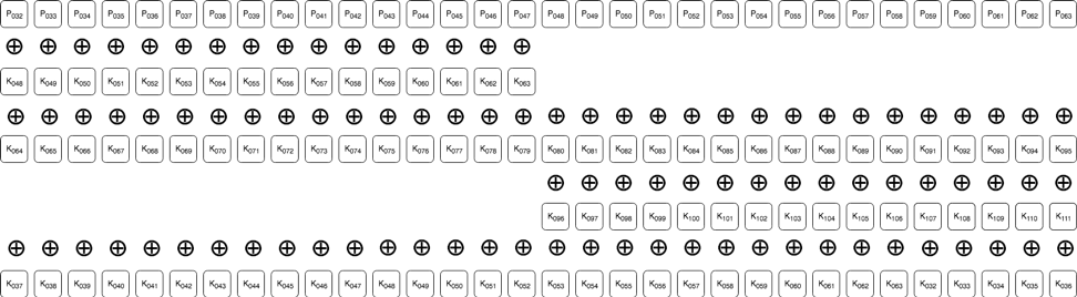 - エッジケース(後述)を除き、各平文ビットは3つのキービットとXOR演算される(2つのキーはフェーズ1、残り1つはフェーズ2で)