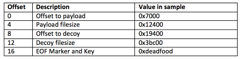 復号化スタブによって明らかにされた関数シェルコードは、ファイル サイズがゼロより大きいファイルを探すオープン ファイル ハンドルを列挙することから始まります。その後、各ファイルの最後の20バイトを読み取り、ファイルの最後の最後にある値「0xDEADFOOD」を探して、配信文書を見つけます。該当するファイルが見つかると、ファイルの最後の20バイトを解析して、次の構造を使用しているペイロードとおとり文書を見つけ出します。