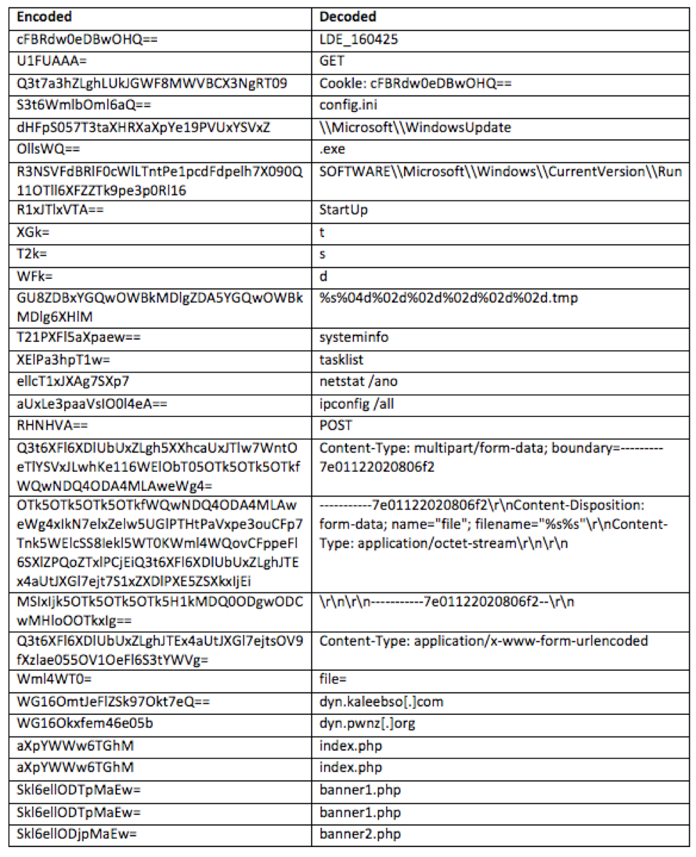 トロイの木馬に埋め込まれた関連テキストの大半は符号化されており、トロイの木馬は、base64アルファベットの大文字を小文字に、またはその逆に変換する変更されたbase64デコード関数を使用してそれらをデコードします。このカスタムbase64デコーダを使用して、次の文字列をデコードします。