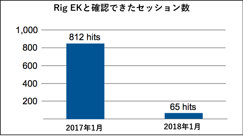 Rig EK活動は、パロアルトネットワークスの提供する脅威インテリジェンスサービスAutoFocusにより、ポート80を経由するWebトラフィックでRigEKFlashContainerというタグが付いた項目を検索することで、簡単に測定できます。AutoFocusは、VirusTotalあるいはVirusSignといったマルウェアの検査サービスに送信されたサンプルに紐づいた、異常値を省いた結果を表示します。このAutoFocusを元に、弊社は2017年1月と2018年1月を比較しました。2017年1月には、RigEKFlashContainerでヒットするセッションが812件確認されました。2018年1月には、同じ検索条件で確認されたセッションは65件にとどまりました。結果として、2017年1月と2018年1月を比較すると、Rig EKは92%も減少したことがわかります。