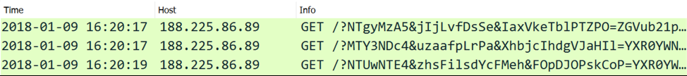 ドメイン名の代わりにIPアドレスを使用するようになったこと以外では、Rig EKトラフィックに1年前と比べて目立った変化はありません。また、いくつかの変化はしてきたものの、URLを見ることでRig EKであるかがすぐにわかります。2017年1月には、Rig EKのURLパターンには、それとすぐにわかる英語の単語が含まれていました。2018年1月には、英語の単語はBase64エンコード化文字列に置換されています。例として以下の画像をご覧ください。