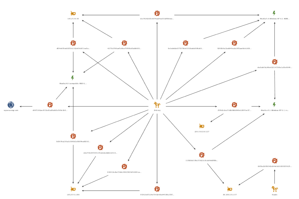 AutoFocusを使用し、ユーザー エージェント文字列を手がかりに、まったく同じユーザー エージェントを使用する3つの追加のZebrocyサンプルにデータセットが拡大しました。これが、185.25.51[.]198および185.25.50[.]93にあるZebrocyの追加のインフラストラクチャにつながりました。この時点で、元のサンプルと関連するC2ドメインに関して30近くのZebrocyのサンプルを収集しました。このマルウェアファミリ固有のアーティファクトに基づき、さらに調査を進めることで、データセットが過去数年間に使用された数百のサンプルに拡大しました。追加のサンプルのほとんどは、ESETで以前報告されたDelphiおよびAutoITの亜種でした。ただし、収集したサンプルのいくつかは、Zebrocyダウンローダー ツールのC++亜種でした。また、完全に異なるKoadicのペイロードが配信されている証拠も発見しました。さらに、ESETのレポートでこれらの攻撃における最終段階のペイロードと述べられている、DelphiバックドアのC2サービスをホストするIPアドレス185.25.50[.]93も見つかりました。