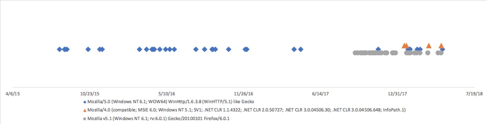 固有のユーザー エージェントの文字列の使用を経時的に調べると、以前はMozilla/5.0ユーザー エージェントのみが使用されていましたが、2017年中盤以降は、3つのユーザー エージェント文字列がすべて、ZebrocyツールによってC2通信用に使用されていることがわかります。