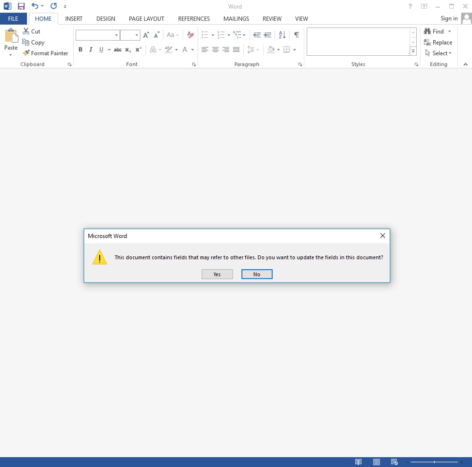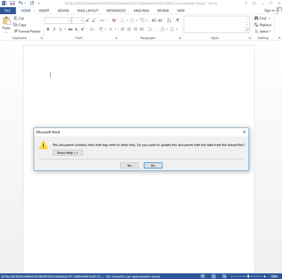 兵器化されたドキュメントの作成者は、すべてのおとりコンテンツの後のドキュメントの末尾にDDE命令を追加しました。ドキュメントがWordで開かれた時点では、Wordはデフォルトでこれらのフィールドのコンテンツを表示しないため、命令は即座には表示されません。以下のスクリーンショットからわかるとおり、DDE命令が存在する行をハイライトしても表示されません。